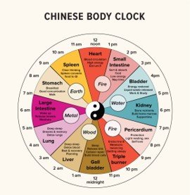 According to TCM, health and wellbeing can be related to a body clock which suggests that certain elements and body parts are activated at specific times. To be healthy one honours these systems and works with, rather than against them.